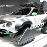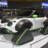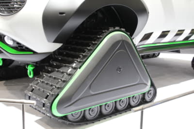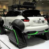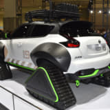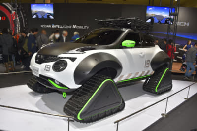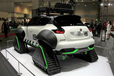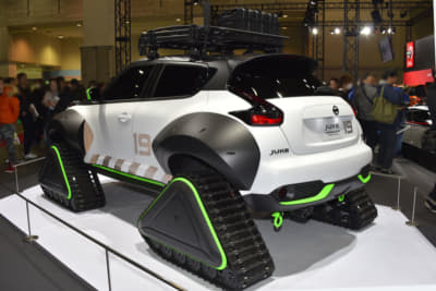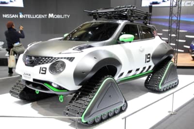続いては大胆なスタイリングで大きな話題となった、ニッサンの『ジューク・パーソナライゼーション・アドベンチャーコンセプト』を見てみよう。雪上のレスキューを想定し開発されたモデルで、最大の特徴はタイヤの代わりに装着された、巨大なクローラーとオーバーフェンダー。