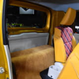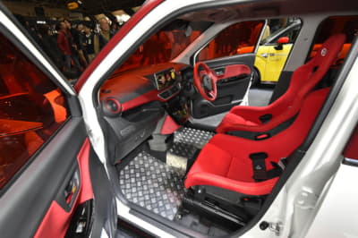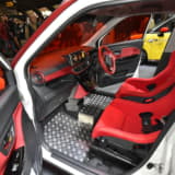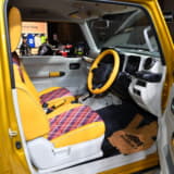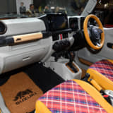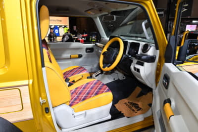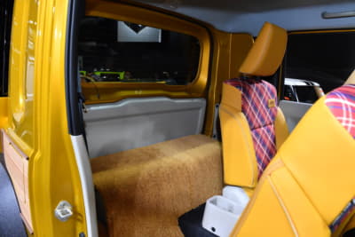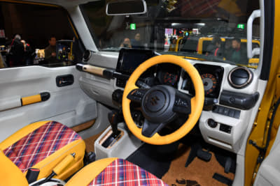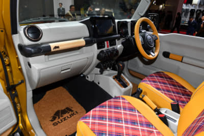 乗車定員は割り切って2名に減らすが、シート後方には荷物を置くスペースを確保する。また内装やシートの生地にはベージュ色やチェック柄を多用し、ポップで若々しい印象に仕上げているのもポイント。ちなみに荷台はスズキの軽トラック『キャリイ』から流用、全長は標準のジムニーシエラから30cm延長したという。