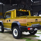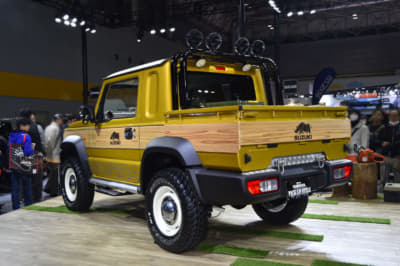 まずはデビュー以来の大人気で生産が追い付かず、納車まで1年なんて話も聞く現行型ジムニーシエラをトラック化した『ジムニーシエラ・ピックアップスタイル』。ボディ後部を荷台にすることで、DIYやアウトドアといた幅広い用途に対応。