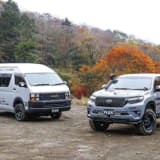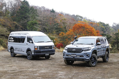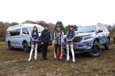 同時にサポートカーとして同行するハイエースもお披露目。フロントフェイスはフレックスの人気ボディキット「リノカ・コーストライン」に変更され、3インチのリフトアップされていた。
