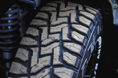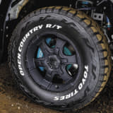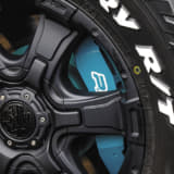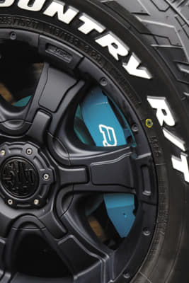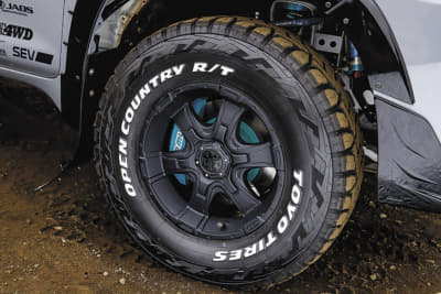 ホイールはクリムソン「MG・ヴァンパイア(F/R8.0×17in inset20)」、そこにTOYO TIRES「オープンカントリーR/T(F/R285/70R17in)」を組み合わせる。新しいR/Tはラリーステージにおいて高いパフォーマンスを発揮するのは既に証明済みだ。その上でコースコンディション次第でM/Tに変更するというプランニング。ブレーキはプロジェクトμの6ポットキャリパー&ローターを搭載していた。