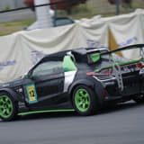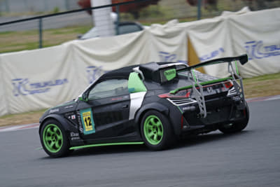 06秒台にはもう一台のカプチーノが入ったが、その間に割り込んでランクインしたのも、地元茨城県から参戦の白い880コペンだった。大容量ターボチャージャーにハイカムシャフトを組み合わせた「も。ファク」エンジンを搭載する170馬力仕様。タイムは、1分06秒495。まだまだ攻めきれておらず、練習すれば 05秒台 も可能とはオーナー。これで、ベスト3のなかになんと新規格の880コペンが2台も入る結果に。この 1分06秒 というのは、トヨタGRが世界ラリーのためにつくったGRヤリスの純正とも変わらないタイムということも特筆すべき点。