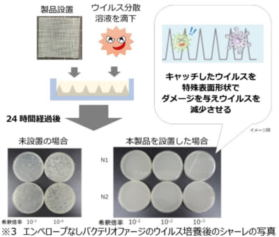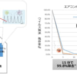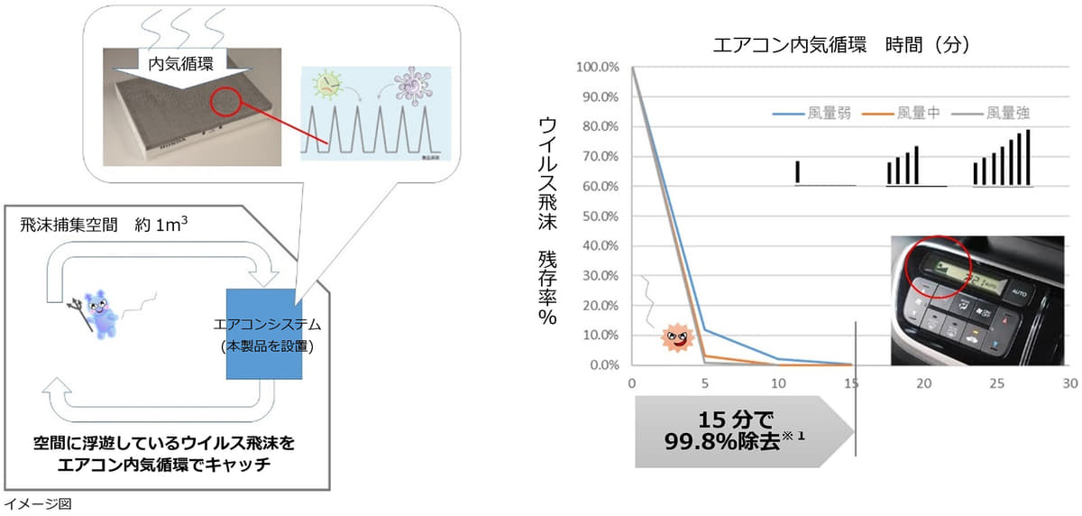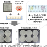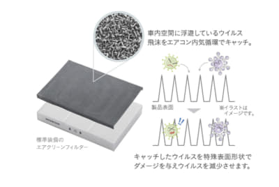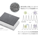 どのようにしてウィルス除去を行うかというと、空調機器に標準装備されるエアクリーンフィルターに、くるますくを重ねる。くるますくで空気中のウィルスをとらえ、くるますくの特殊な表面形状によってウィルスに損傷を与え、減少させるのだそうだ。