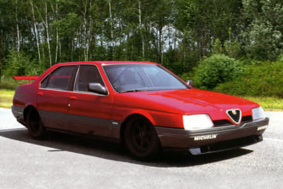 参考までに、市販の164の写真も貼っておこう。こうして見ると、164プロカーの外観が、低い車高やリアスポ以外、おおむね164そのものだったことがわかる。しかし、中身には市販車の要素はほぼ皆無。アルミとカーボンで出来たシャーシは、アルファロメオがF1でタッグを組んでいた関係を生かし、ブラバム(MRD=Motor Racing Developments Ltd)に製作を依頼。