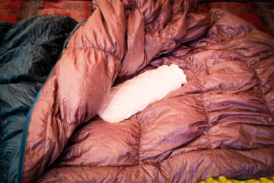 いっぽうダウンは水濡れに弱く洗濯も専用の洗剤が必要と、メンテナンスに気を遣う面があるものの、保温性の高さと柔らかい寝心地が期待でき、また軽いうえコンパクトで収納性にも優れている。寒い季節や登山しながらのテント泊、移動手段がバイクや自転車ならダウン一択だろう。そのダウンの性能を把握する目安として知っておきたいのが、ダウンジャケットなどにも使われているフィルパワー(FP)という単位。数値が大きいほどたくさんの空気を含み、断熱性や保温性が高いことを示しており、予算が許すならば600フィルパワー以上の製品を選びたい。