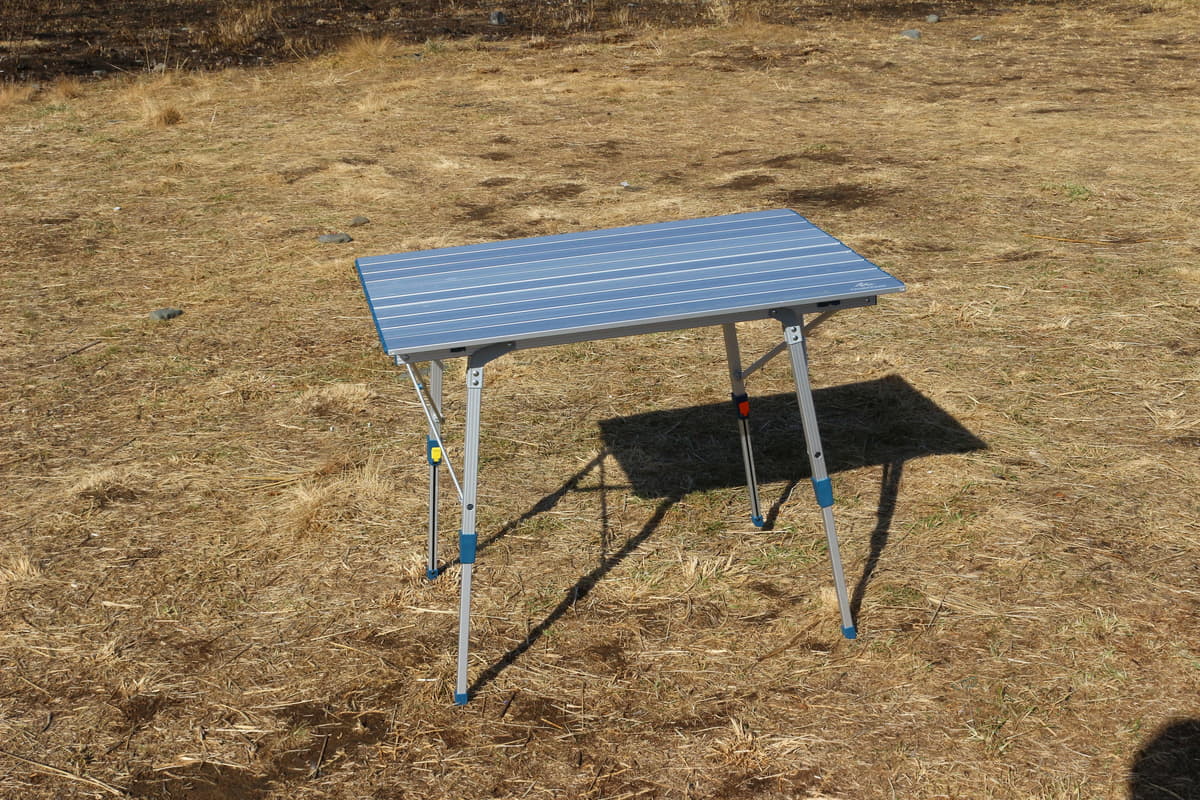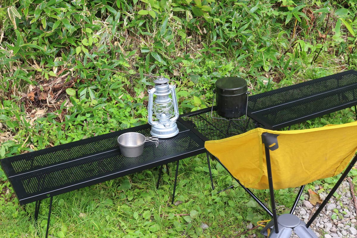 ただし、天板には隙間ができるため小さなものを置くと挟まることがあります。キャンプではシングルバーナーなどを載せた時に隙間に脚が挟まると傾き危険ですので、隙間を上から塞ぐ耐熱シートを敷くなどの工夫が必要でしょう。また、細長い板がコードで連結されているものは、長く使っているとコードが劣化して伸びたり切れたりしますので、こちらもご注意。