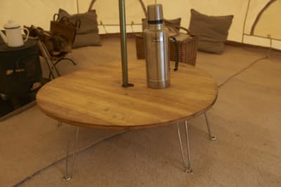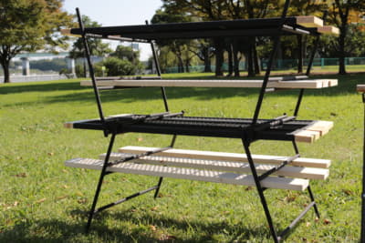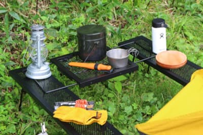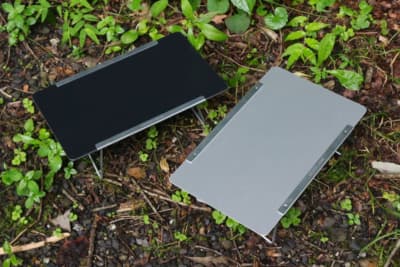 焚き火台のまわりで使うことを考えられたテーブルで、鉄やステンレスなど耐熱素材天板が使われたテーブル。焚き火台に載せていた鍋やケトルを火から外して中を確認する、火にかけた鍋に食材を追加するようなときに便利で、高さは低めで幅も狭いものが多くあります。焚き火台を使わないときでも、座ったまま作業をするときに重宝します。