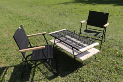 細長い板がコードやジョイントでつながっている天板で、くるくる丸めて持ち運べるのがロールトップテーブル。細長くまとめられるのでキャンプ場に向かう車内のちょっとしたくぼみや足元に置けるので、広いラゲッジを取れないクルマのユーザーに人気のテーブルです。収束タイプのチェアとひとまとめで収納できるのもメリットのひとつ。
