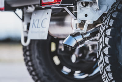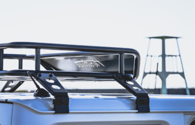 ボトム部分にはスキッドプレートを付属。腹下のパーツを隠す役目も果たすし、ロゴ文字をくり抜いたデザインがスタイリッシュで、単なる懐古的なスチールバンパーではない、今っぽさを醸し出す。