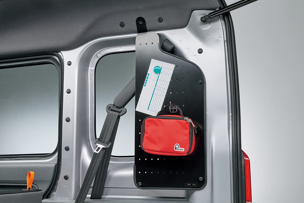 また車中泊やキャンプでは積載する荷物が増えることも多い。そんな荷物の収納&整理整頓に役立つアイテムも取り入れたい。例えばクォーターパネルに取り付けることができる有孔ボードもそのひとつ。