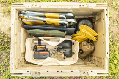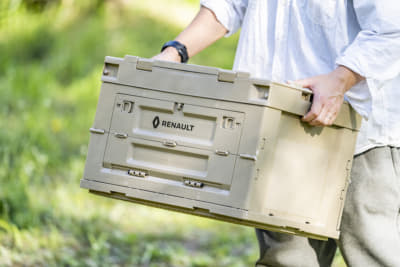 4月30日午前10時から発売されたカングー アウトドアキットBOX」は専用の50L折りたたみ可能コンテナに収納されている。オリジナルロゴ入りのプライウッド製で、スタイリッシュな見た目もいい。