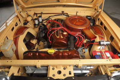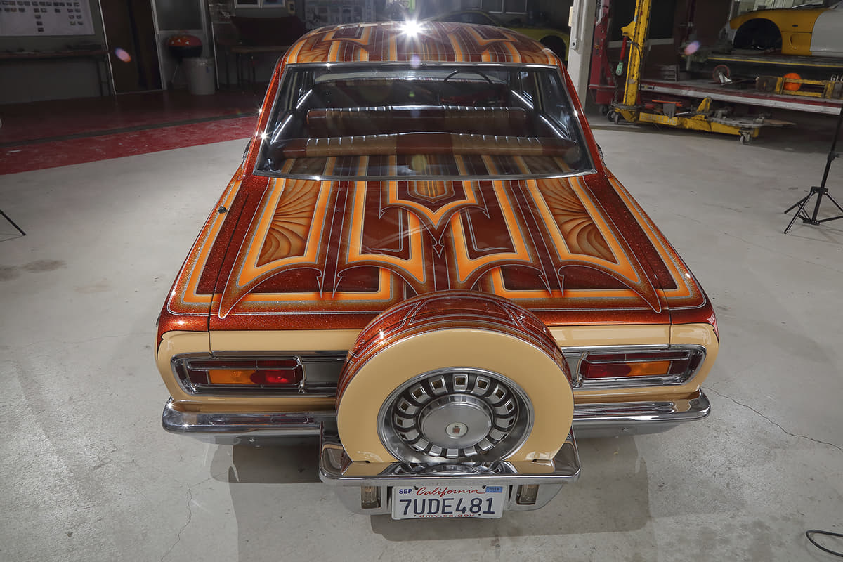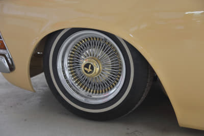 ヘッドライトは純正形状の社外に変更。LEDにはせず、旧車らしく電球を備える。フロントグリルは純正のまま。少しヤレているが、趣があっていいとさえ感じる。 リヤに備えているコンチネンタルキットは、キャデラック用を3分割してサイズに合わせて小さく加工して装着。「当初は付ける予定ではなかったんですが、作業を進めるうちに何となく付けたくなったんですよね」。