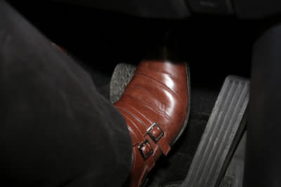 AT車の発進プロセスは次のようになります。まずブレーキペダルに乗せていた右足の踏力を弱めて、クリープでクルマを動かし始めます。つまり、最初にクルマが動き始めるときにはアクセルペダルの上に足はおかれていません。クルマが動き出してから、足を右にずらしてアクセルを踏みこみます。