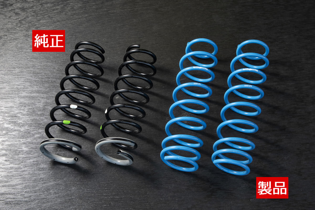 車高はそのままに、乗り心地を改善したい人には、ショックだけを交換するこのプランがオススメ。下の写真を見てもわかるとおり、ショック自体の太さを純正以上に確保することで、剛性と操縦安定性を向上。さらに純正と比べ、ショックがストローク(伸び縮み)する速度をゆるやかにし、乗り心地アップを実現する。