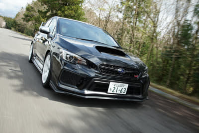 純正でも十分にスポーティと思えるレヴォーグ。ハイパーマックスSを装着することで、そのクセのないニュートラルな動きを生かしながらも、しっかり感が強調された走りが体感できる。リヤにはヘルパースプリングがセットされており、伸び側のタイヤ設置性をしっかりと確保してくれているのがわかる。