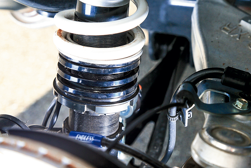 また、アッパーマウントは前後とも強化ゴムを使い、縁も面取りするなど、随所にこだわりが見える。細かいボディ振動を吸収し、しなやかな走りを実現させるためだ。さらに、全長調整式にありがちなサビによる固着を防ぐため、PNEコートを施している。表面がなめらかになることで、車高調整時の作業がスムーズになるのもうれしい点だ。