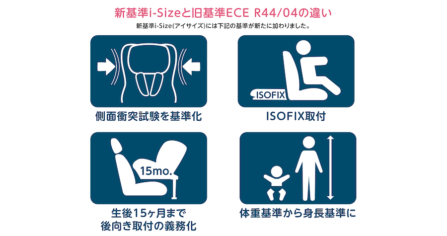 また今回「R129(i-SIZE)では「後ろ向き装着」をする期間も変わりました。まだ骨格が脆い乳幼児の命を守るためには、できるだけ長い期間、万が一の衝撃を広範囲に分散して受け止めることができる「後ろ向き装着」とすることが重要です。でも「R44/04」では体重9kg(およそ生後12カ月頃)から前向き装着ができるとされており、専門家からは「それでは早過ぎる」という指摘が多くありました。