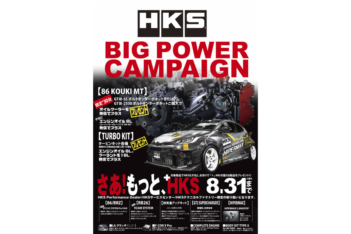 ちなみにHKSでは8月31日(火)まで「HKSビッグパワーキャンペーン2021」が開催されている。期間内にハイパーマックスSを含む車高調やマフラーを購入。商品に添付されている応募券からネットで応募すると、もれなくHKSのオリジナルバッグがもらえるという。さらに抽選で4名には「京商ミニッツ HKS Gr.A GT-R#87」が当たるのだ。また、各アンテナショップでもお得なキャンペーンを展開しているので、そちらも確認してほしい。チューニングを考えているなら、今が断然お得なのだ!