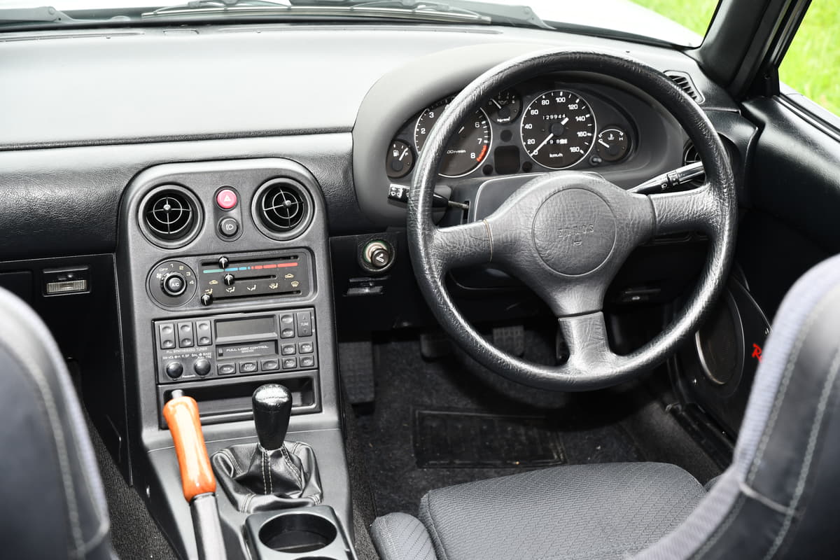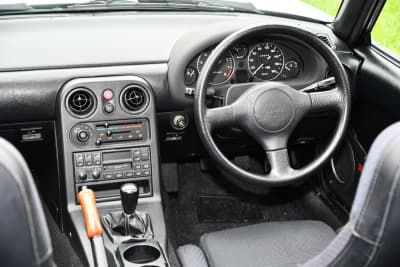 このチェックのときに、マツダ(株)伏見亮さんに「このクルマ、パワステですか?」と言われたのが強く印象に残っているそう。佐々木さんとしてはロードスターは全部パワステに決まっていると信じていたからだ。じつは初期のロードスターではパワステ非装着車が選択できて、その場合はステアリングがMOMOではなくて、ウレタン素材になるのだそう。当の伏見さんによると、たまたまウレタン製が付いていたので、そのレアな“重ステ仕様”かなと疑っての発言だったそうだ。