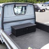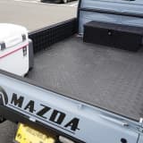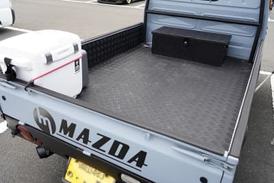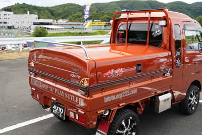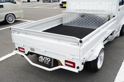 荷台に取り付けたガルウィング開閉式のカバー付きボックス「トラボ」と鱗柄マットガードを組み合わせたアメリカンテイストでまとめている。