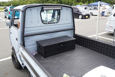 「最初はシャコタンにしようと思ったけれど、住んでいるのが降雪地域なので、下げると冬乗れなくなる。だったら流行りのアゲにしようと思ったのがきっかけです。トラボの中に入っているのは釣り関連のグッズのみで、軽トラですけど一切汚れたものは積みません。
