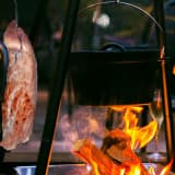 ブロック肉であればトライポッドに吊り下げて、半日以上、焚き火にかける炙り料理もオツなもの。炎があたるかあたらないかのギリギリの距離であぶるのが、美しく、おいしく炙るポイントだ。