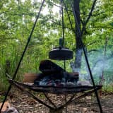 食欲の秋、豪快な焚き火料理を狙うなら、杉板やトライポッドを用意したい。