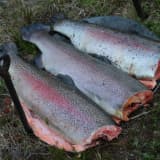 ビッグサイズのトラウトサーモンやサケが手に入ったら、杉板(野地板)に杉のくさびで貼り付けて焚き火で炙る「ロイムロヒ」に挑戦。弱火でうまみを閉じ込めつつ火を通し、焚き火の香りをまとう野趣あふれるごちそうだ。