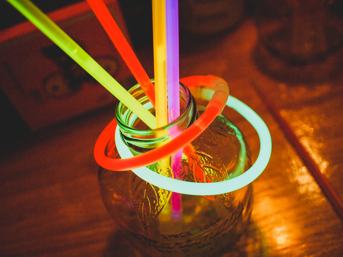 前項で紹介したLEDのイルミネーションライトは派手すぎて………という人におすすめしたいのが、釣り具店や100均で売られている「ケミカルライト」だ。本来の使い方は釣りで使用する浮きやルアー、竿先に装着するもので、スティックに内蔵されたガラス管を折ることで内蔵された液体が化学反応を起こして発光させることできる。このケミカルライトをロープやペグに取り付けることで危険の防止に大きく役立つ。