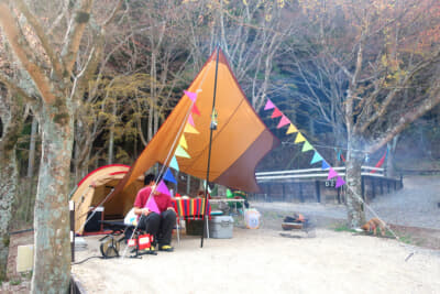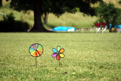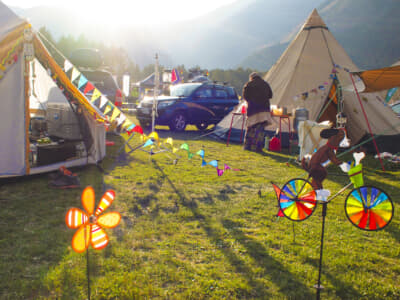 キャンプサイトを飾るウインドスピナーやガーランドフラッグ。一見、派手な飾りに思えるかもしれないが、小さな子どもを連れてのファミリーキャンプにはとても重要なアイテムとなることを覚えておこう。