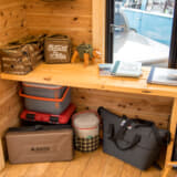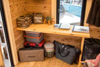 ログ小屋のサイズは壁芯で3.2m×2m、床面積でいうと6.51平米で約4畳に相当するスペースがある。無垢材ゆえ自分で棚やベッドを好きなように造作できるので、リモートワークの拠点にするもよし、趣味部屋にするもよし、キャンプを中心にしたリラックス空間にするもよし。四方に大きなガラス窓があるので採光と換気にも優れている。
