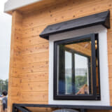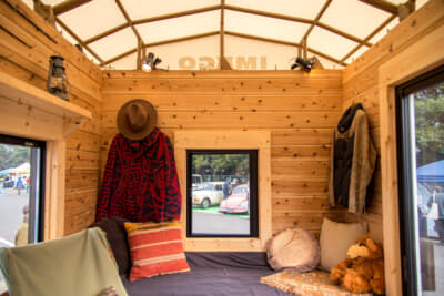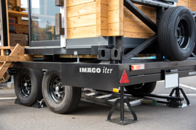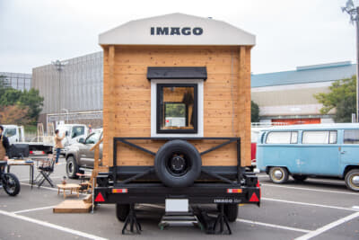 「IMAGO iter(イマーゴ・イーテル)」と名づけられたこの「ログ小屋トレーラー」は、12フィートのモデル。厚さ70mmもある国産杉の無垢材を使った本格派のログ小屋だ。
