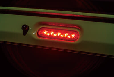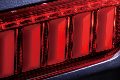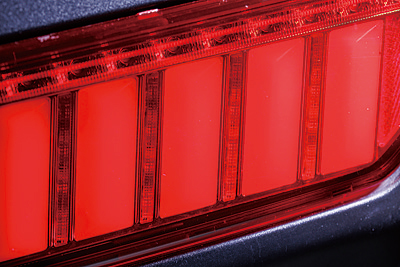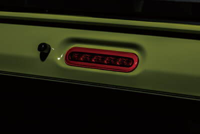 上段のウインカーは片側12発、下段の片側6個のライトバーがポジションランプとなる。このライトバーの間にあるのがブレーキランプで、片側にタテ5本がデザインされる。内側には片側4発のバックランプが備わり、コンパクトな設計だが白色LEDは劇的に明るい。もちろん消灯時もクールなスタイリング。