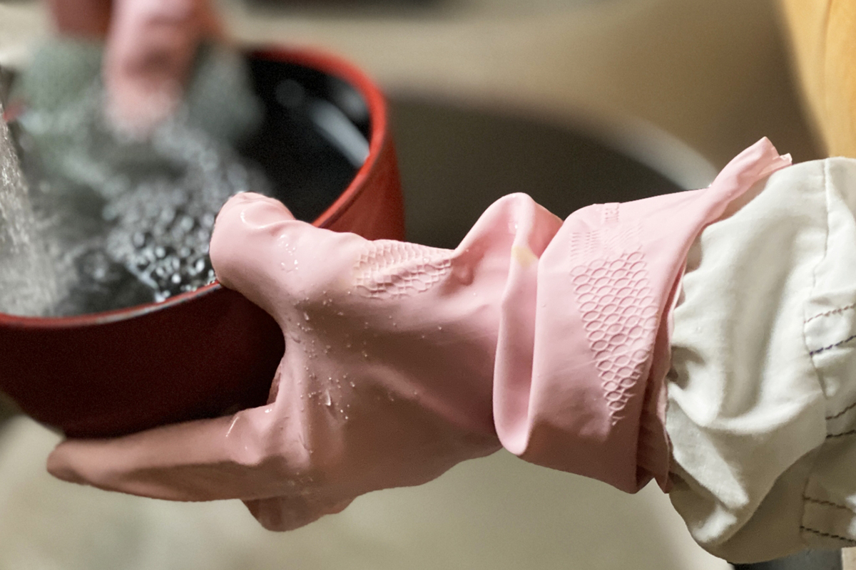 また、洗い物はビニール手袋を着用することでずいぶん楽になる。袖口を濡らさない長めのものを用意しておこう。