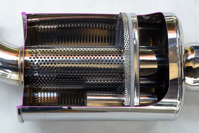 対するチューニングマフラーでおもに使われているのは、ストレート構造と呼ばれるもの。サイレンサー内を穴のたくさん空いた筒が真っ直ぐに通り、そこのなかを排気ガスが通る。筒の周りにはグラスウールが敷き詰められ、その布団のようなウールに音を吸収させる。チューニングマフラーでも隔壁構造を採用することもあるが、遥かに広い大広間を排気ガスが通過するようなイメージで効率がいい。
