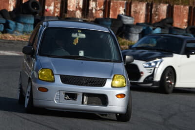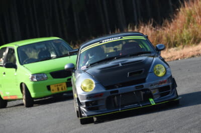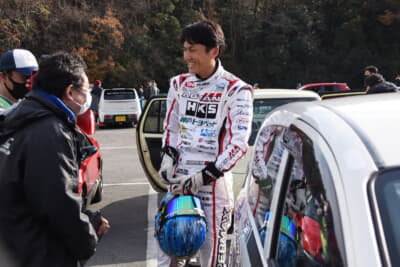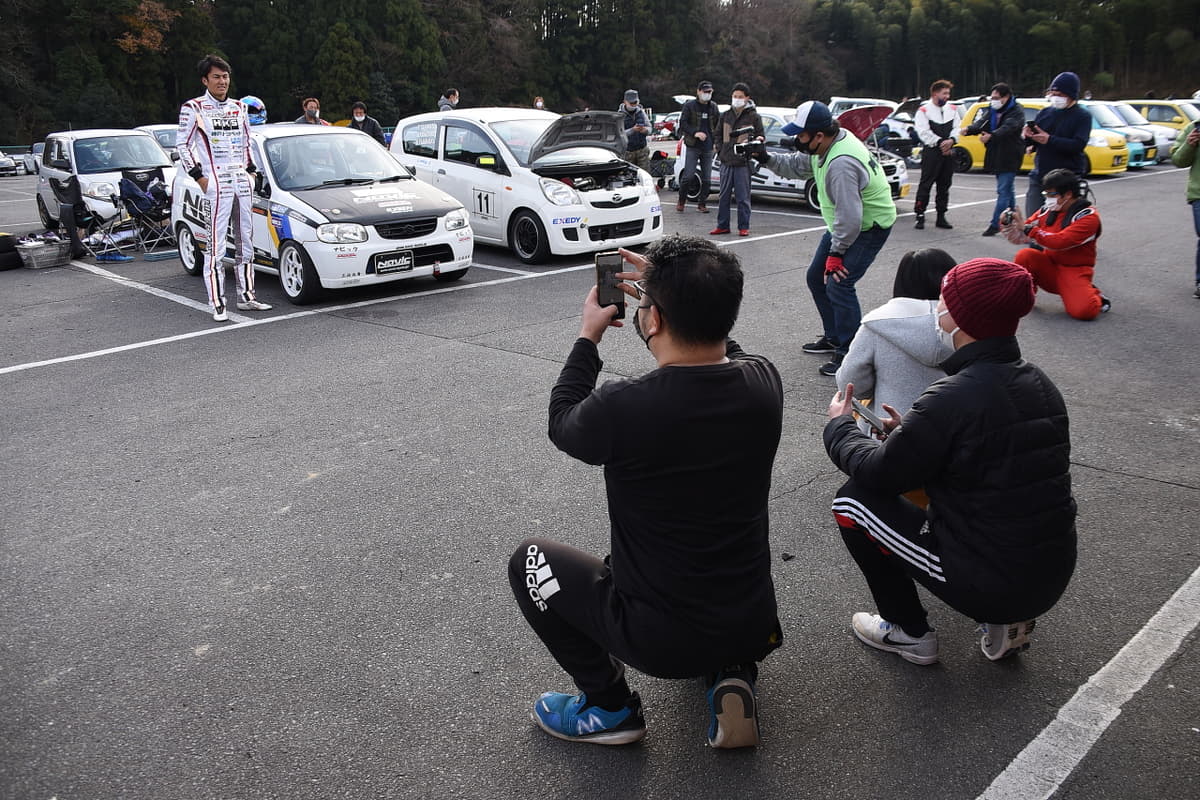 まずは会場を周って各参加者の車両を見て回ったりして話を聴き、さらにショップのデモカーを含め、5台のKカーでサーキット試乗を行った。初めてのコースに初めての車両であるにもかかわらず、参加車両が走行しているなかをかき分けながら、ベストとまではいかないものの、良いタイムで走行を重ねていく姿を見て、参加者から「さすが!」の声が上がる。状況が許せばもっと攻められることを匂わせながら、「オーナーには敵わなかったけど、安全マージンを取っていますから(笑)」とタイムについてはコメント。