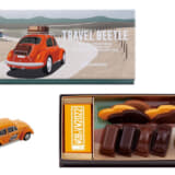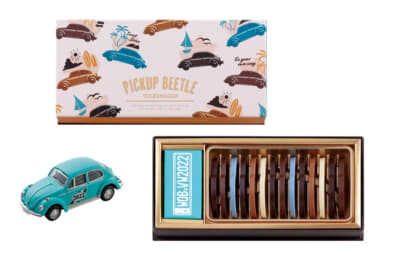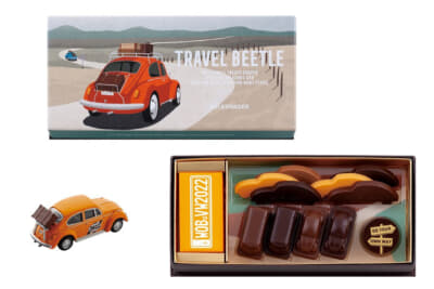 旅の途中の「ビートル」や「バス」をイメージしたひと箱。道路に立つサインを表現した、丸いチョコレートがポイント。こだわりのリヤキャリアとトランク付きミニカーは、後ろ姿がキュート。11個入り2376円。
