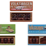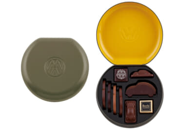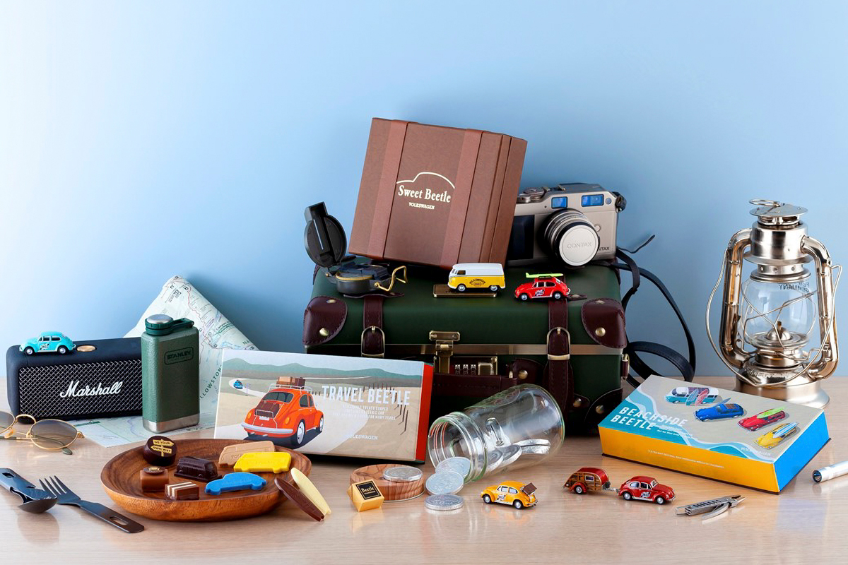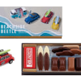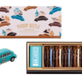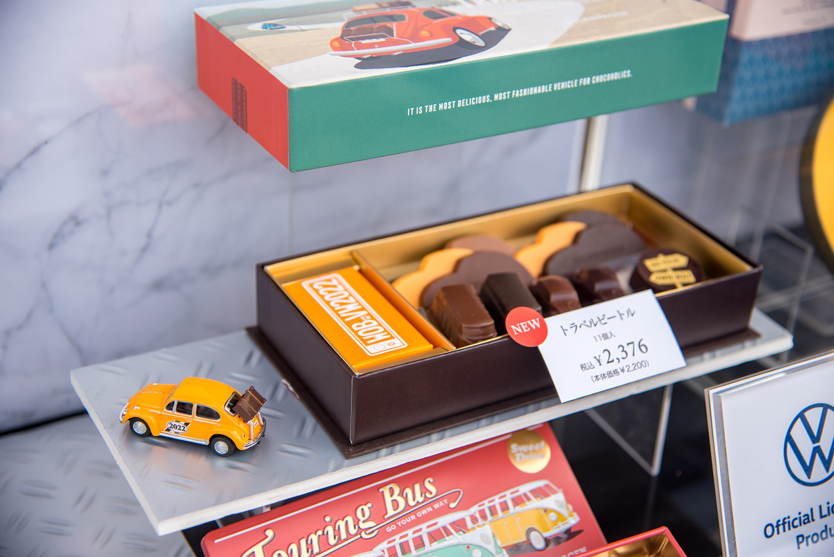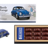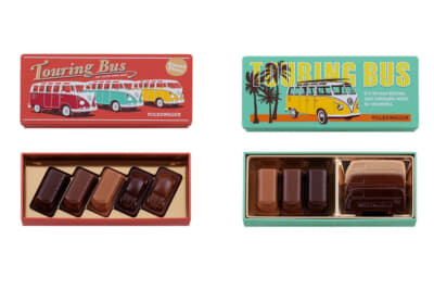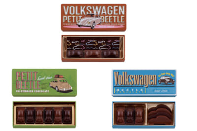 クラシック・ビートルのフロントトランクに搭載されていた「工具箱」をモチーフにしたオリジナル缶。工具のように詰め合わせたチョコレートは、シンプルなプレーンチョコレートを中心に、ストロベリーやナッツ、柔らかなキャラメルの味わいを楽しめる。12個入り1512円。