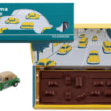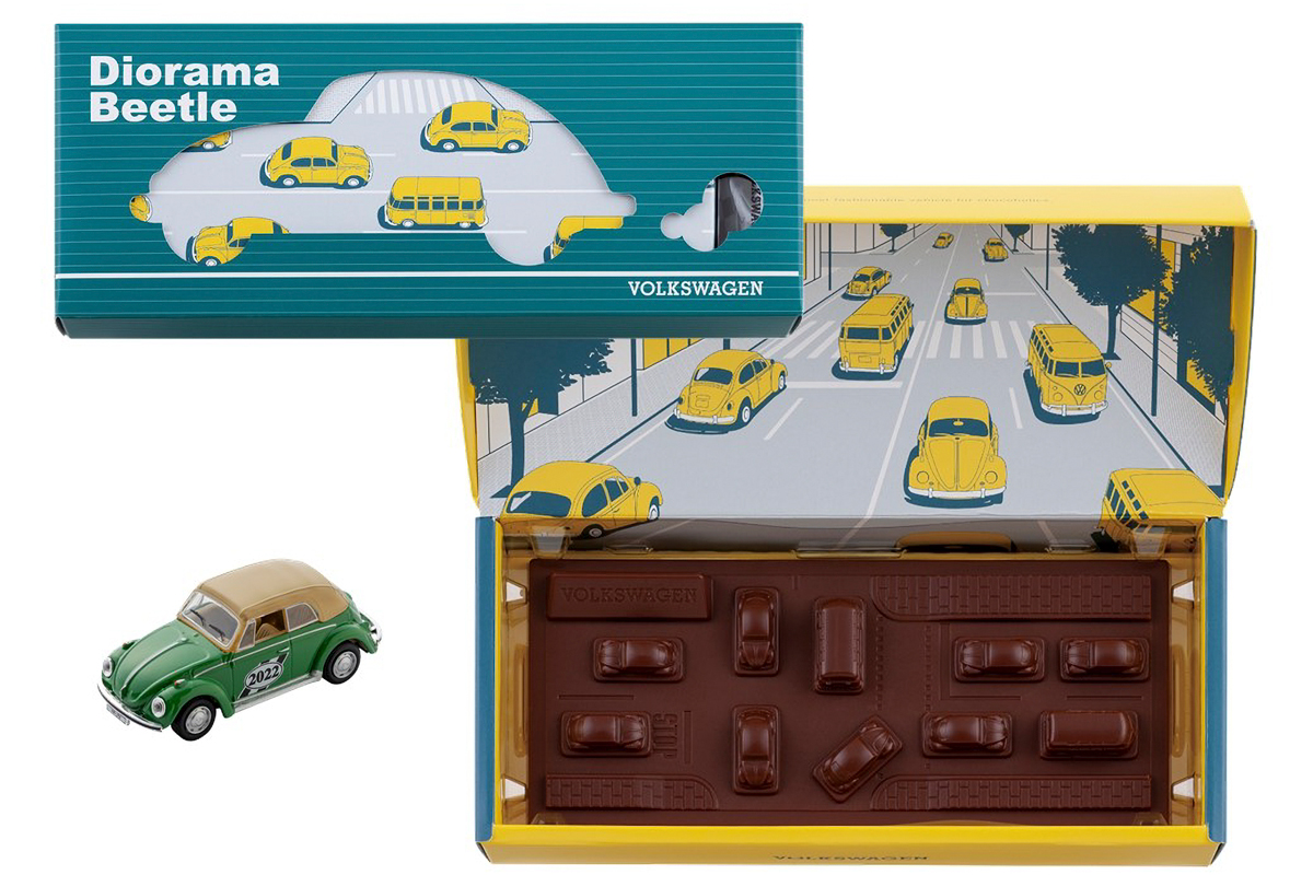 ふたを開くと、ビートルやバスが行き交う街並みが広がるユニークなひと箱。精巧にできたジオラマをイメージしたタブレットプレーンチョコレートだ。グリーンのソフトトップ仕様ミニカー付き。162g(1個)入り1512円。