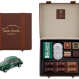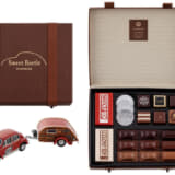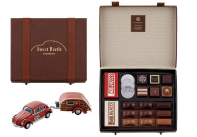革張りのトランクをイメージしたボックスに、ミニチュアのビートル型、バス型チョコレート、キラリと光るコイン型チョコレート、ナッツやフルーツの味わいのチョコレートなど、洋酒不使用の味わいを詰め合わせ。18個入り(4320円)はレッドのトレーラー付きミニカーが付属し、13個入り(2700円)にはグリーンのミニカー単体が付属する。