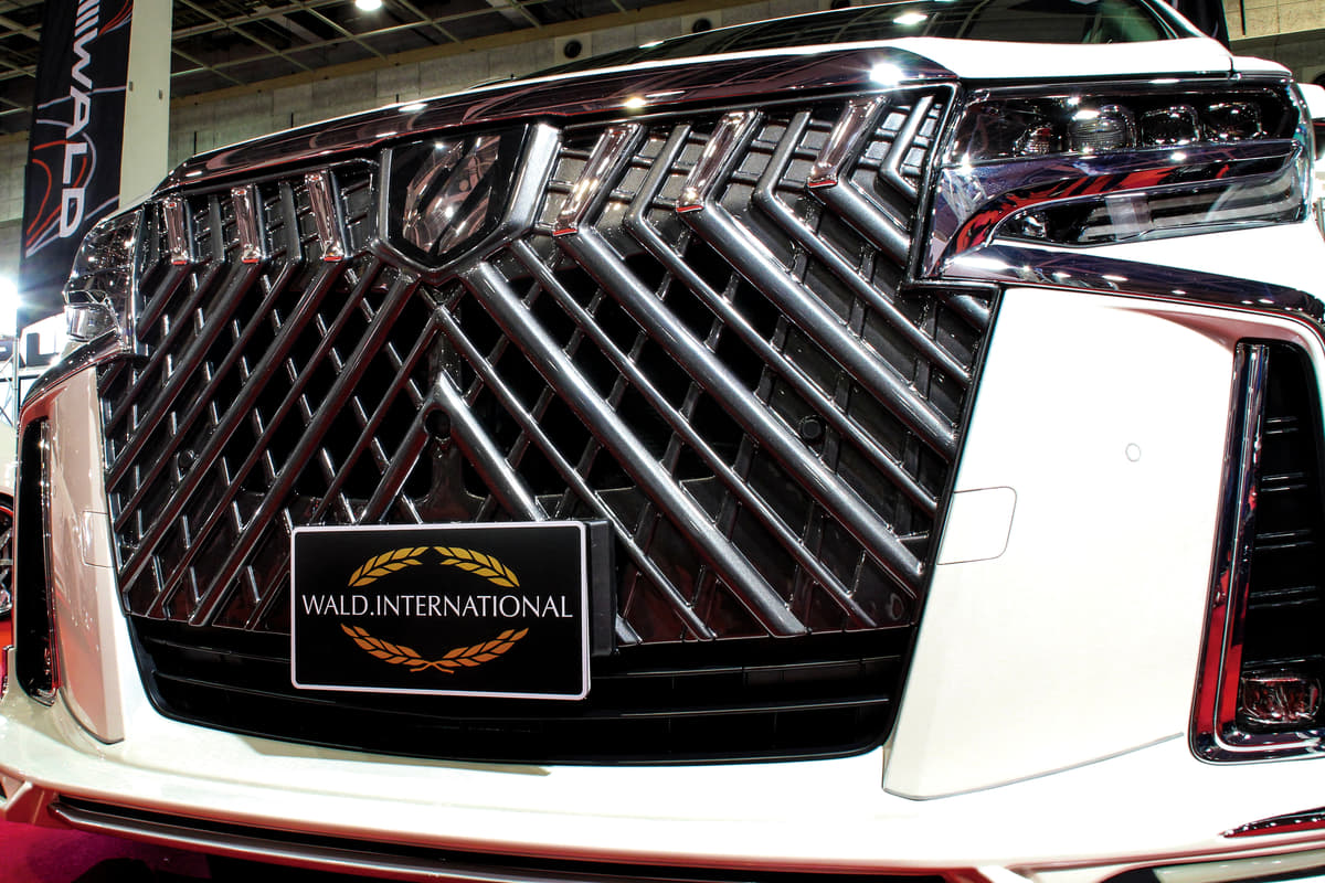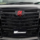 中央からシャープに広がるようなインナーメッシュを採用。外枠はアルファードのまま、レクサスのミニバンを思わせるルックスにイメチェンできる。本体はフィッティング性能の高いABS製で、メッキガーニッシュも付属している。