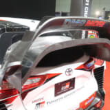 ヤリスWRCの最大の特徴は、そのエクステリアというかボディデザイン。確かにベースと言われるヤリスの基本シルエットを持っているのですが、装着されたエアロパーツが半端なくすごいのです。とくにリヤビューは、ステー部分と翼本体とをカーボンファイバーで一体成型したウイングを二段重ねに装着。