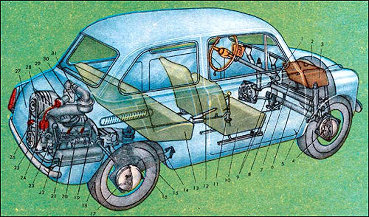ルックスや、リヤエンジン・リヤ駆動のレイアウトといった基本設計こそフィアットを踏襲しているが、中身はソ連のオリジナル。ソ連初の空冷V型4気筒エンジンを搭載し、4輪独立懸架サスペンションも採用されていた。V4エンジンは当初746ccの23psで、1962年にマイチェンした「965A」では887ccにアップして27psに、さらに1966年からは30psにパワーアップしている。