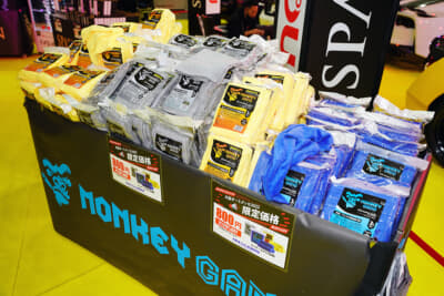 お土産にピッタリなのはワックス塗布用の「スポンジマカロン」に、コーティングやワックス拭き取りなど目的ごとに設定される「モンキータオル」。いずれも大阪オートメッセ2022限定の800円で販売されている。