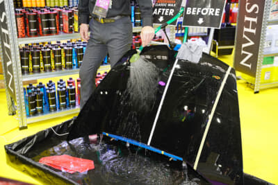 コーティング剤やシャンプー以外ではボディに傷を付けずに洗車でき、グローブタイプなので細かい隙間にも届きやすい「ベロアミット」や、繰り返し使って吸水力が落ちたタオルを復活させつつキレイにする、洗車用タオル洗剤「ビーバック」といった画期的なアイテムもあった。