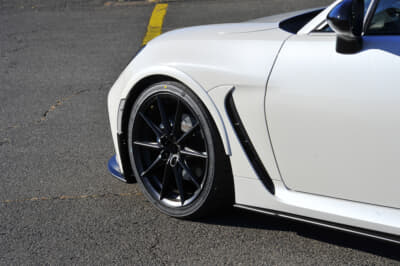 さりげなく地面との隙間を埋めることでクルマを低く見せる。オーバーフェンダーはギリギリサイズのタイヤ&ホイールがボディから突出することを防ぎ、保安基準に適合させる。しかも、申請の必要のない片側約7mmワイドになるというこだわりだ。