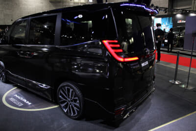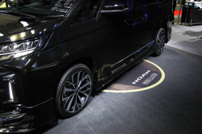 モデリスタ仕様のノアのデザインコンセプトは「Brand new Elegance」。ワイドに伸びたメッキ加飾を施し、精悍さのなかにエレガンスを感じる個性的な表情を演出します。展示車両はフロントスポイラーやサイドスカートなど、全面的にエアロパーツを装着できるエアロパーツセットBに加えて、メッキパーツで構成されるクールシャインキットを装着。さらに各種LED電飾パーツも装着されていて、若干暗くされた展示ブースでその存在感をアピールしていました。