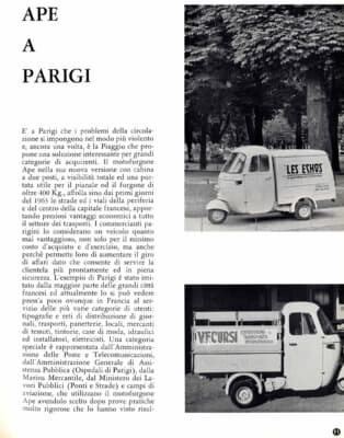 何せスクーターと多くのコンポーネントを共有するがゆえ燃費は良く、イタリアの旧市街の狭隘な道に荷物を運びこむのに最適だった。初めて大衆が目にしたものの定石で、当初は新ジャンルとして「モト・バン」とあだ名されたアぺは、17万リラという安価さで零細企業でも導入しやすかった。それでいて初期モデルは98ccだった2輪スクーターとは対照的に、最初から2ストローク125ccのより力強いエンジンを搭載。アぺは瞬く間に受け入れられ、イタリアの商活動のリズムを加速させた。