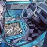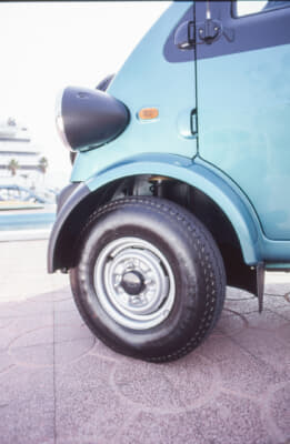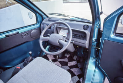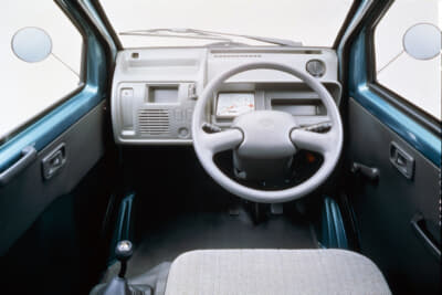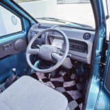 エンジンは、当時のダイハツ車でお馴染みだったSOHCのEF-CK型で、キャブレターを組み合わせていたのも時代だろう。最高出力は31psと非力だったが、580kgという車重には十分だった。またタイヤ&ホイールは10インチで、ブレーキは全輪ドラムブレーキと簡素なもの。車内は当然必要最小限の余裕しかなく、メーターもスピードと燃料計のみというシンプルさだった。