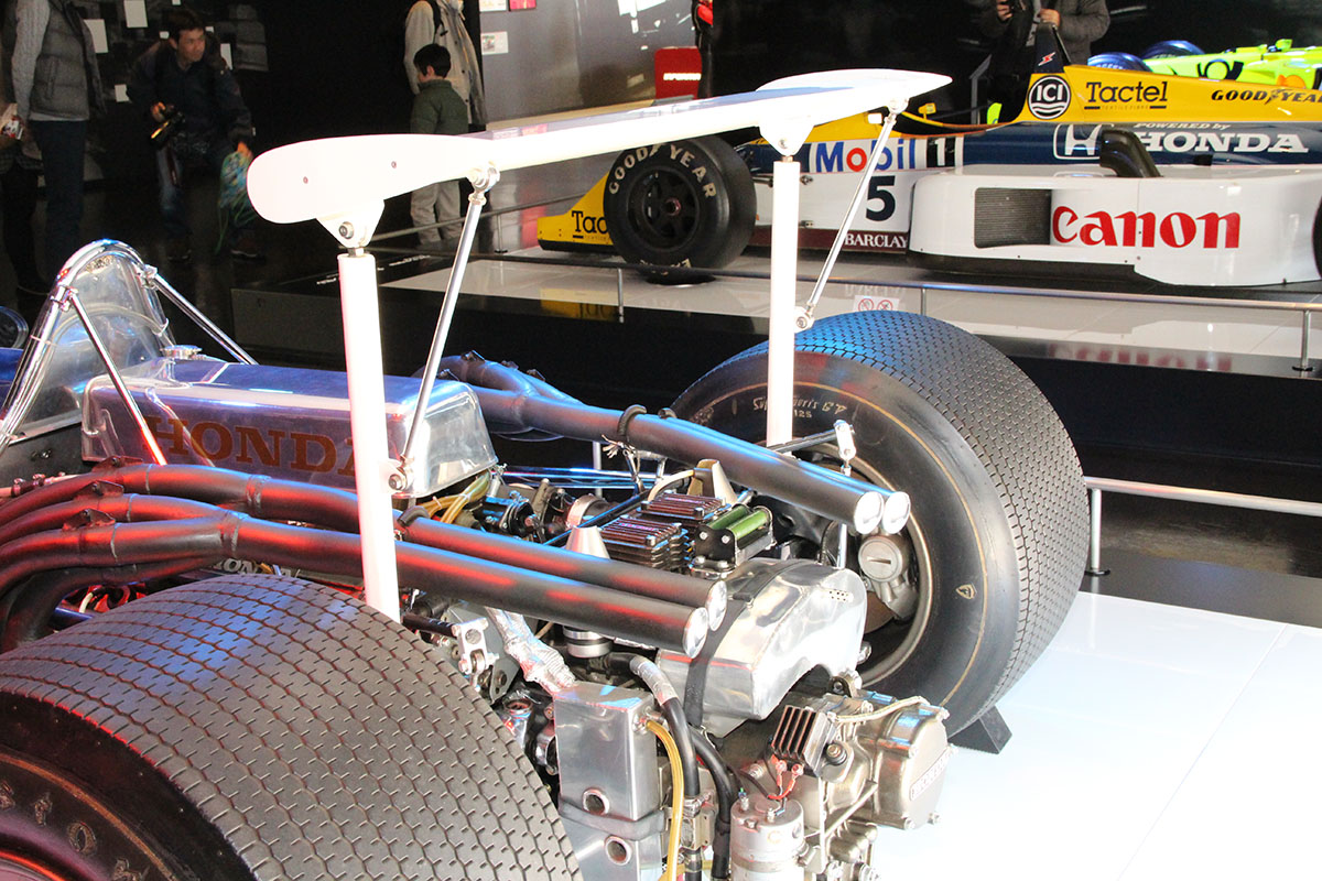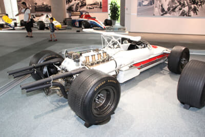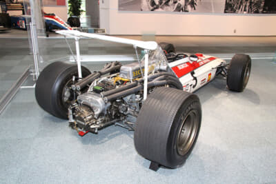 残念ながら、手許には当時の写真も少なく、ホンダ・コレクションホールに収蔵されている1968年のRA301とRA302で確認するしかないのですが、RA301はリヤ左右のアップライトにステーを立てて、RA302はロールバー後部にやぐらを組み、それぞれ大きなウイングを装着していることが分かります。見ただけで怖そうです。